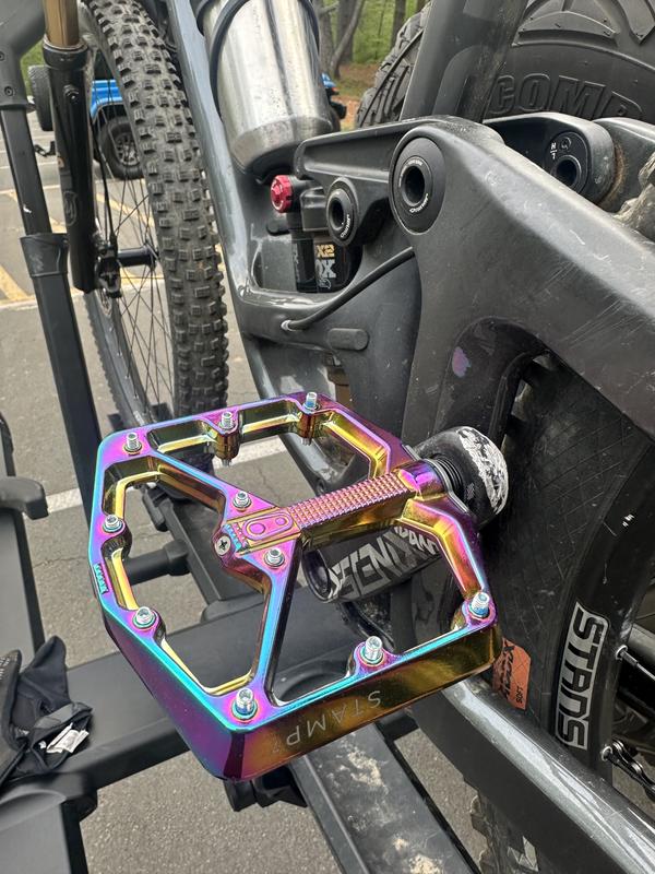I was SO stoked to get my hands (well, feet) on a pair of these oil-slick Stamp pedals! They look amazing and I get compliments on almost every ride. They are naturally a heavier pedal than something made of plastic, but I know they will last a long time and wont get beaten up, despite the very chunky/rocky riding that I do. They work extremely well with my 510 Contact flat shoes and they match the rest of my oil-slick aesthetic very well. I ride with the smaller pedal size, my shoe size is a woman's 7.5. The large would be too big for me. Also, it is a HUGE plus that these pedals can be taken apart and repaired/serviced.