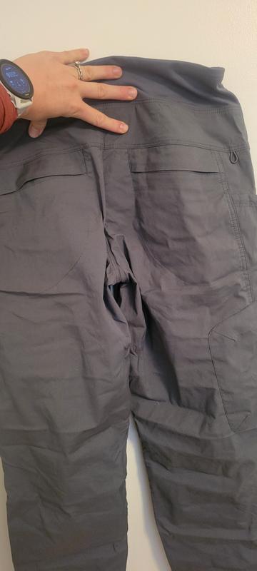 I've worn these pants at work and for climbing. The waistband is wide and soft with no pinching, and (bonus) very flattering with a cropped shirt. They are a durable fabric, which is great for rougher terrain. I have longer legs, and these sit well above the ankle, which is nice for climbing, but they can feel a little short if I'm wearing them for work because the cuffs will ride up to my calves.